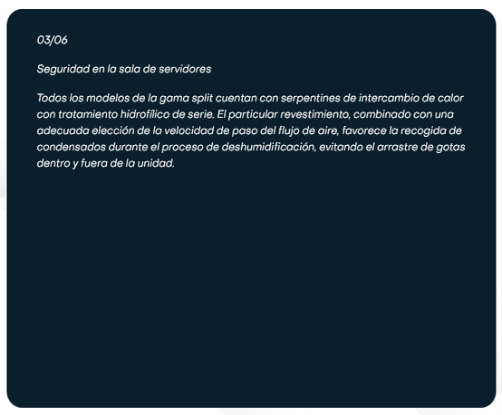 Los aires acondicionados de precisión de la serie HTS son equipos específicos para centrales telefónicas y shelters. Diseñados para instalación en techo o pared, son aptos para la climatización en plantas donde el espacio interno es reducido o totalmente dedicado a equipos tecnológicos. La disposición racional de los componentes internos facilita la instalación de estas unidades de AAP, también gracias a los numerosos accesorios disponibles, lo que hace que el HTS sea adecuado para diferentes configuraciones de data centers. Las unidades han sido cuidadosamente diseñadas desde el punto de vista termodinámico y aeráulico para garantizar la máxima eficiencia energética.