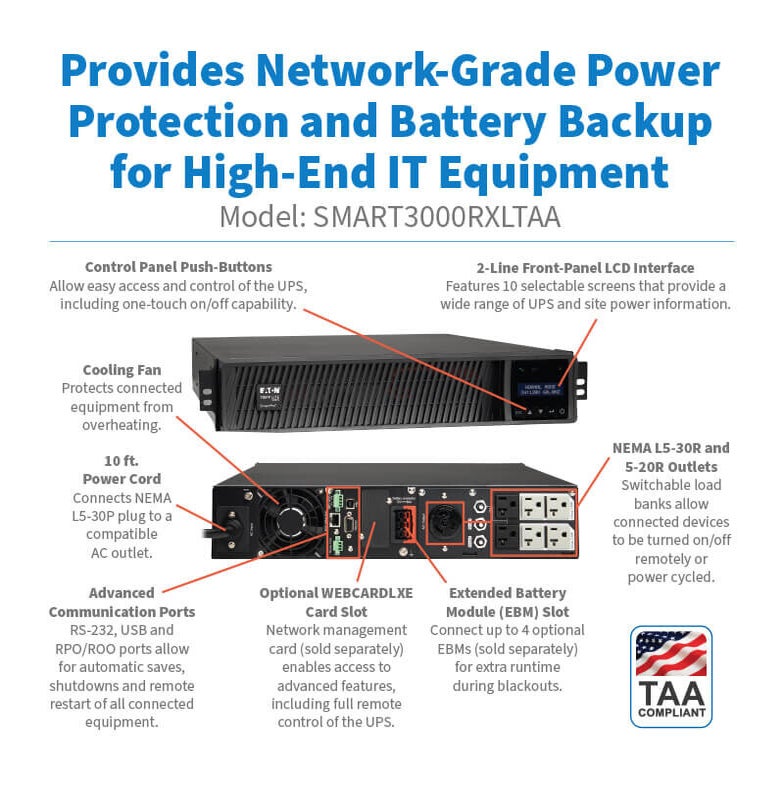 Tripp Lite series UPS SmartPro de Línea Interactiva 3000VA 3000W 120V, Onda Sinusoidal - 7 Salidas, Capacidad de Ejecución Prolongada, Opción de Tarjeta de Red, Pantalla LCD, USB, DB9, Montaje en Rack/Torre de 2U, Cumple con la Ley Federal de Acuerdos Comerciales(TAA [Trade Agreement Act]).