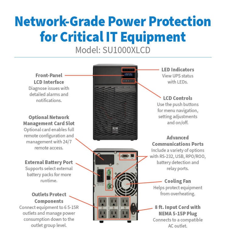 Tripp Lite series UPS SmartOnLine de doble conversión, 1000VA, 900 W, 120 V - 6 tomas, autonomía extendida, opción de tarjeta de red, LCD, USB, DB9, torre.