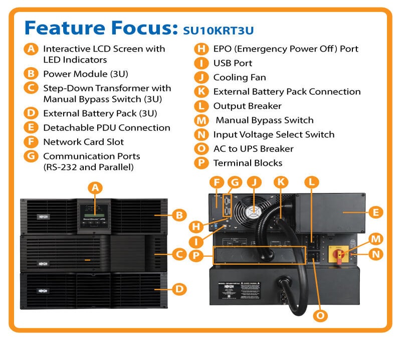 - SU10KRT3U – Sistema UPS de Tripp Lite en línea de doble conversión, de 10kVA / 10,000VA / 9000 Watts en configuración de torre / rack de 9U totales (Módulo de potencia UPS de 3U, módulo de baterías externas de 3U y transformador reductor de 3U)