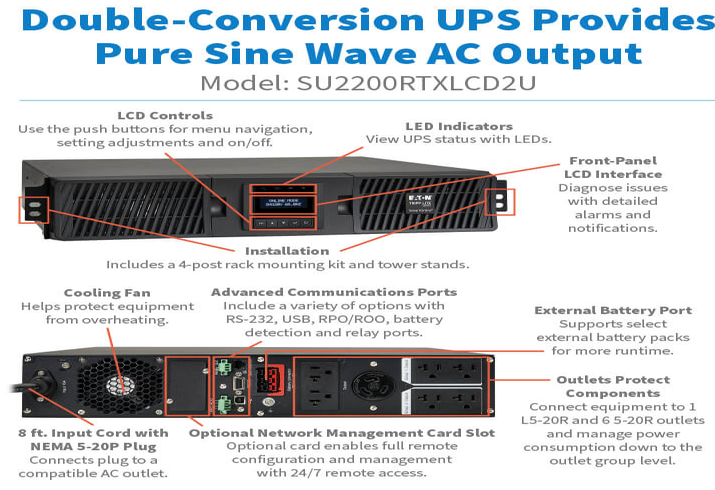 Proporciona respaldo por batería, protección de energía y salida de onda sinusoidal para instalaciones de TI de misión crítica, redes periféricas y otras aplicaciones avanzadas de red.