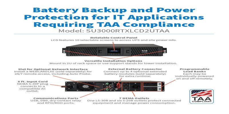 Proporciona respaldo por batería, protección de energía y salida de onda sinusoidal para instalaciones de TI de misión crítica y otras aplicaciones de red que requieren cumplimiento con la TAA.