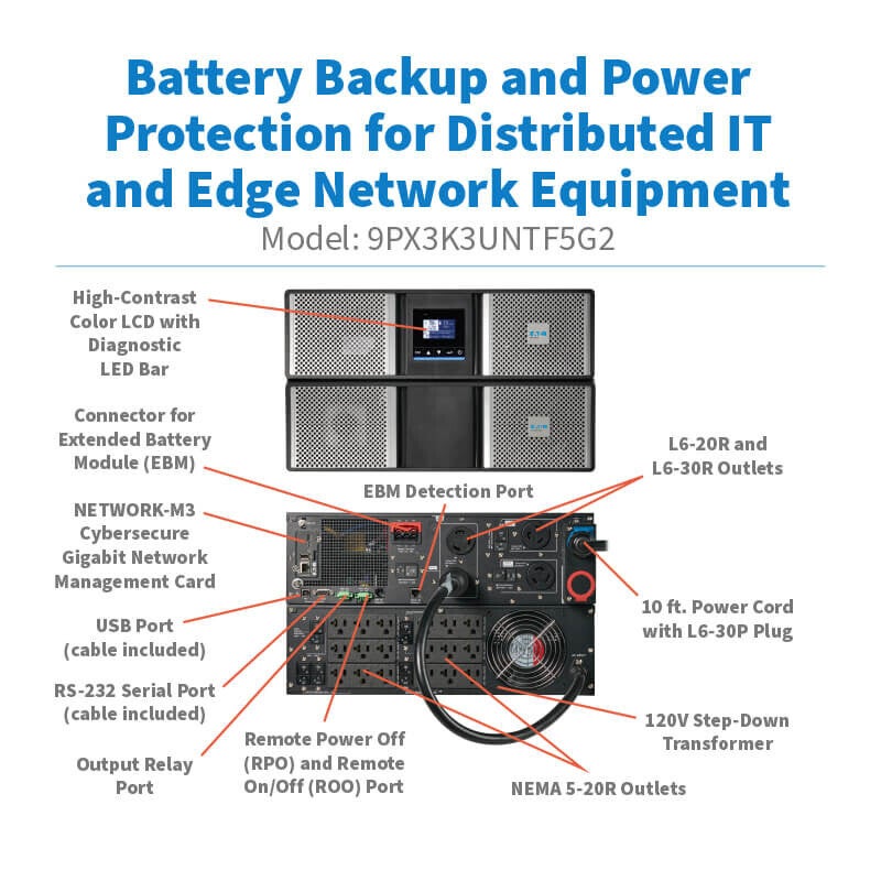 Eaton UPS en Línea de Doble Conversión 9PX G2 3000 VA 3000 W 208/120 V: Entrada Cableada o L6-30P, 18 5-20R, 2 L6-20R, 1 L6-30R, Tarjeta de red Cibersegura, Autonomía Extendida, Montaje en6U de Rack/Torre.