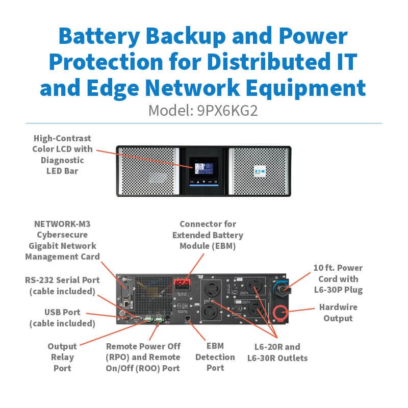 Eaton UPS 9PX G2 6000 VA 5400W 208 V en Línea de Doble Conversión – Entrada L6-30P o Cableada, 2 L6-20R, 2 L6-30R, Salida Cableada, Tarjeta de Red Cibersegura, Autonomía Extendida, Montaje en 3U de Rack/Torre.