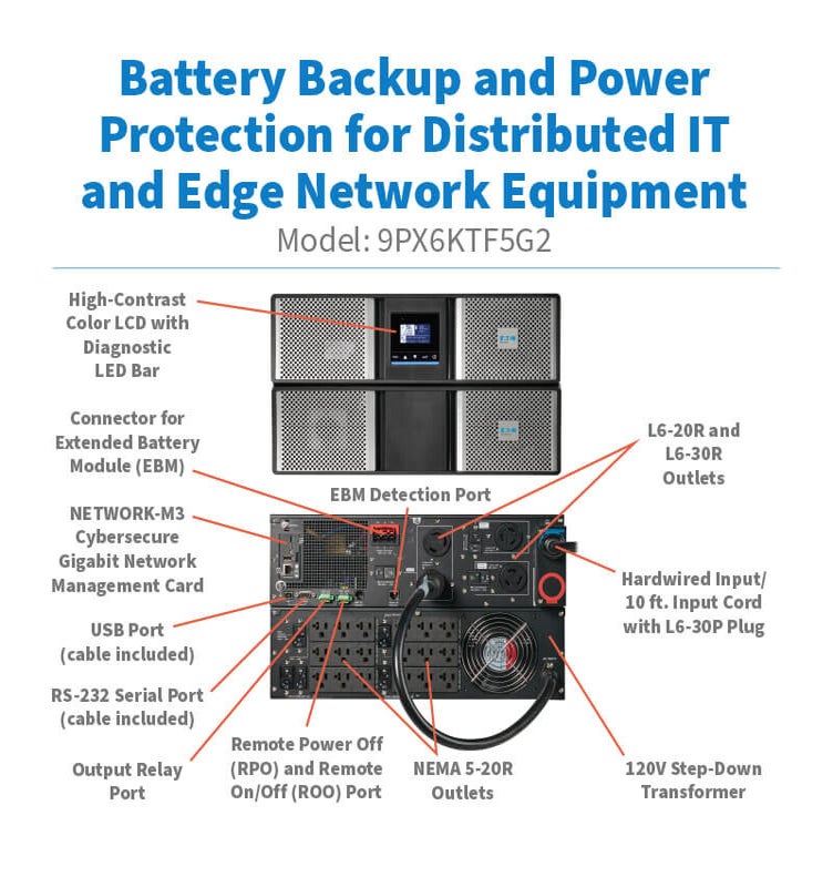 Eaton UPS en Línea de Doble Conversión 9PX G2 6000 VA 5400 W 208/120 V - Entrada L6-30P o Cableada, 18 5-R20, 2 L6-20R, 1 L6-30R, Tarjeta de Red Cibersegura, Autonomía Extendida, Montaje en 6U de Rack/Torre.
