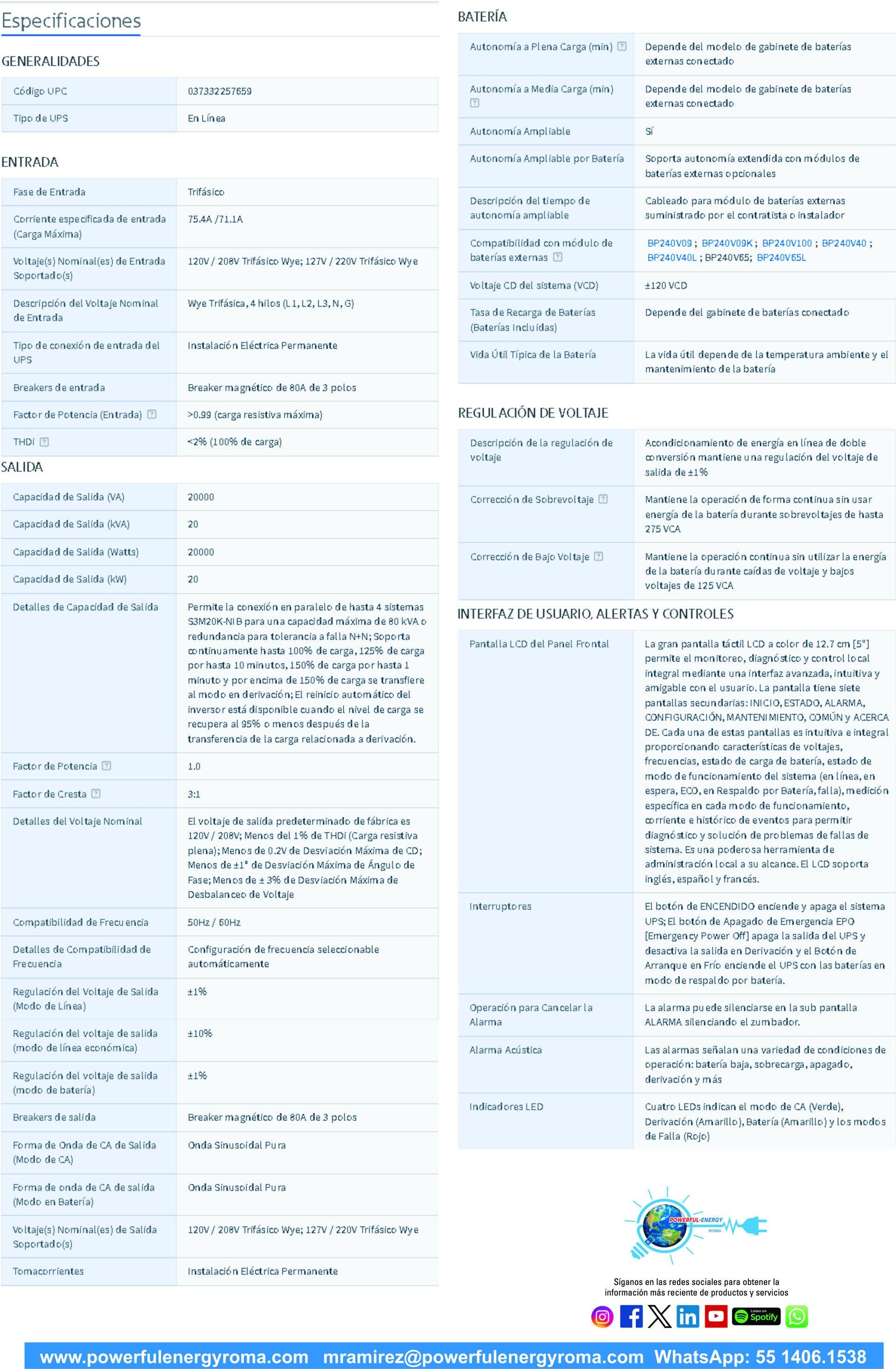- S3M20K-NIB – UPS Trifásico de Doble Conversión de 20kVA/kW de 208V / 220V / 120V / 127V