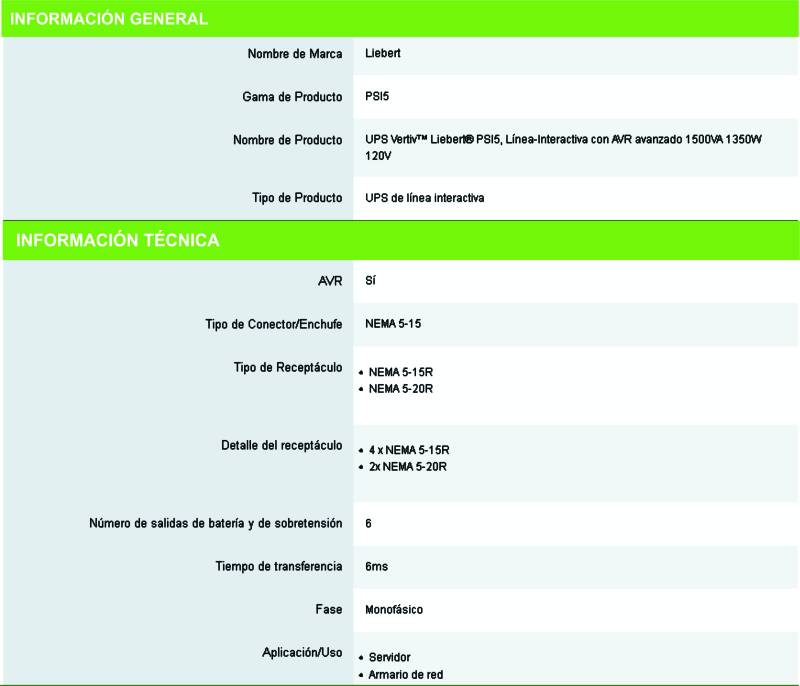UPS Vertiv Liebert PSI5, Línea-Interactiva con AVR avanzado 1500VA 1350W 120V