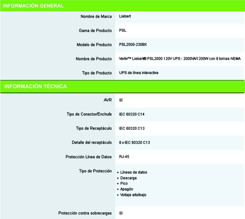 El UPS Liebert PSL viene en tamaños que van desde 650VA hasta 2000VA y ofrece tomas que cuentan con respaldo y supresor de picos. El puerto de comunicaciones USB para la conexión con una computadora local, el cable USB y el software de monitoreo permiten que los usuarios puedan recibir alertas remotas.